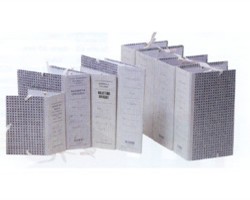 Realizzati in cartone foderato con carta goffrata. Fettuccia rivettata. Angoli protetti da rinforzi metallici. Colore grigio.